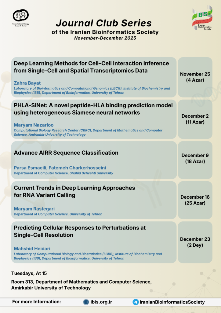به اطلاع علاقهمندان میرساند، انجمن بیوانفورماتیک ایران در ادامهٔ روال سالهای گذشته، در پاییز ۱۴۰۴ سلسله جلسات ژورنالکلاب تخصصی خود را با همکاری آزمایشگاه زیستمحاسباتی (CBRC) دانشگاه صنعتی امیرکبیر از سر میگیرد.